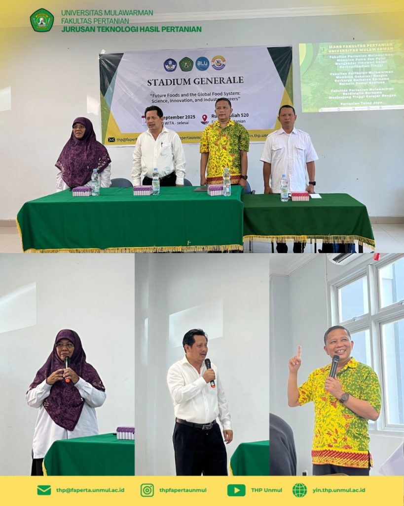 Samarinda, 29 September 2025 – Jurusan Teknologi Hasil Pertanian (THP) Fakultas Pertanian Universitas Mulawarman menggelar kegiatan Studium Generale dengan menghadirkan pakar pangan nasional sebagai narasumber. Kegiatan yang berlangsung di ruang 520 Faperta ini menghadirkan Addion Nizori, S.TP., M.Sc., Ph.D, Ketua Lebih lanjut