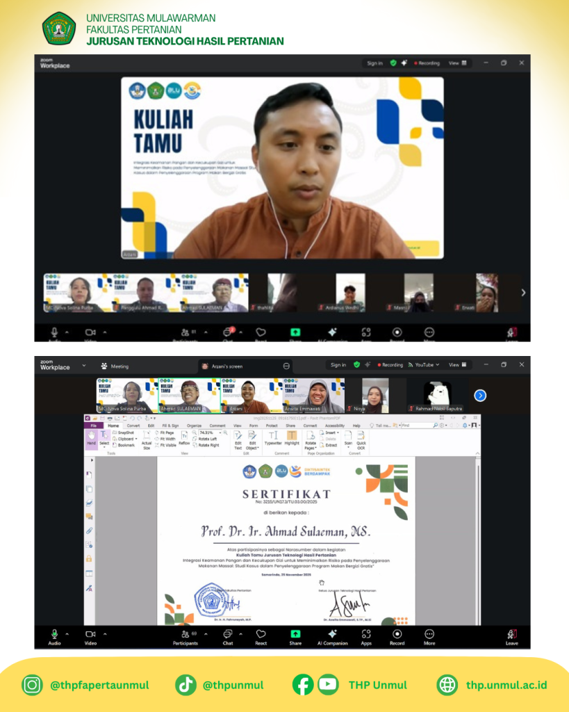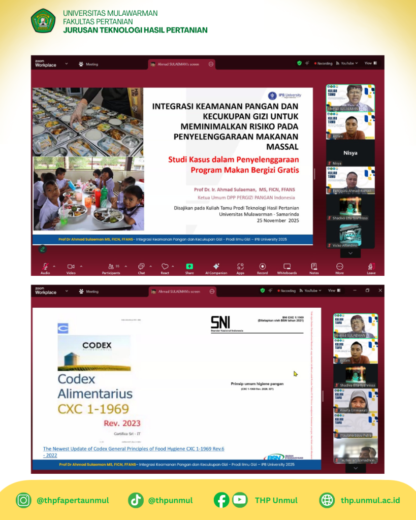 Samarinda, 25 November 2025 – Jurusan Teknologi Hasil Pertanian (THP) Fakultas Pertanian Universitas Mulawarman menggelar kuliah tamu dengan menghadirkan narasumber Prof. Dr. Ir. Ahmad Sulaeman, MS, dosen Departemen Gizi Masyarakat IPB University.